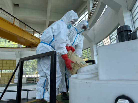 此次演練圍繞原水油跡污染及pH異常偏低兩個場景展開。演練中,發現“取水口出現少量油跡污染”后,吸水泵房巡檢人員立即上報并警戒現場,應急小組迅速攜帶攔油網、吸油毯趕赴現場,30分鐘內完成油污攔截與吸附,快速控制污染。隨后模擬原水pH值為6.3時,吸水泵房應急加藥系統迅速啟動,現場處置組協同配置藥劑、調試設備,精準投加調節,不到1小時即讓水質穩定在安全范圍。演練過程中,吸水泵房作為一線處置陣地,及時啟動應急預案,確保取水水質符合生產要求。同時,將觀洞水庫作為備用水源隨時待命,形成“即戰即防”的堅實防線。
