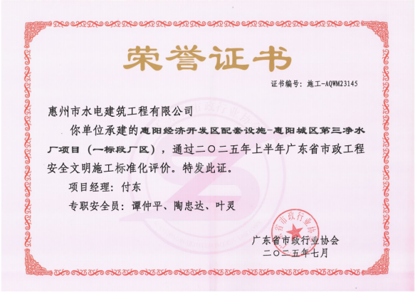 近日,由惠州水務集團水電公司承建的惠陽經濟開發區配套設施—惠陽城區第三凈水廠項目(一標段廠區),順利通過2025年上半年“廣東省市政工程安全文明施工標準化”評價。這一榮譽不僅是對市水電公司項目管理與施工水平的高度肯定,更是對他們始終堅持高標準、嚴要求推進安全文明施工的生動詮釋,為行業樹立了可借鑒、可推廣的標桿典范。