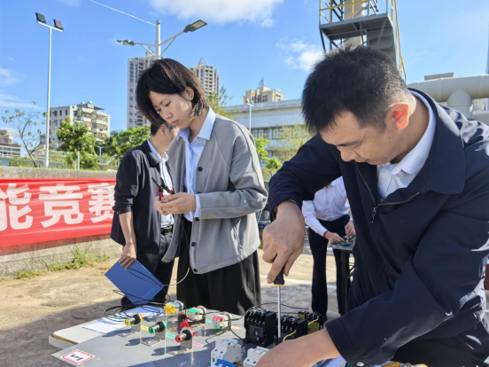 電路接線賽場同樣扣人心弦,參賽選手們屏氣凝神、全神貫注,紅綠黃黑四色電線在指尖靈活穿梭,剝線、接線、布線每一步操作都展現出扎實的專業功底。其中,江北水廠鐘考敏、李玥佳組成的男女搭檔更是成為全場焦點,二人沉著應戰、緊密協作,最終以14分13秒、96.2分的優異成績摘得該項目一等獎。